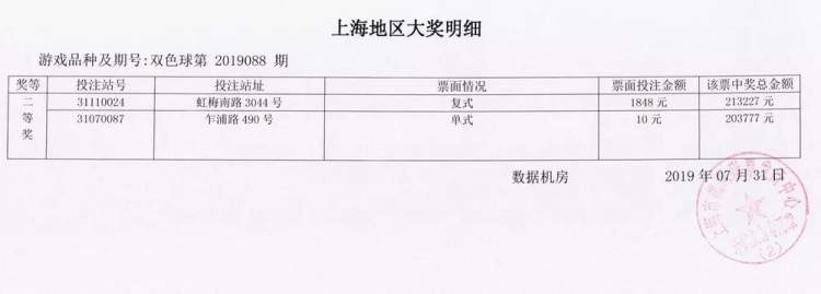 数据显示,上海中得2注二等奖,单注奖金203777元,分别售出于虹梅南路3044号、乍浦路490号福彩销售点。