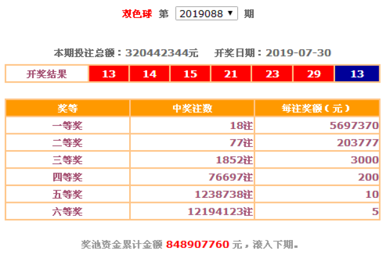 7月30日晚,中国福利彩票双色球游戏进行第2019088期开奖。当期双色球红球号码为13、14、15、21、23、29,蓝球号码为13。