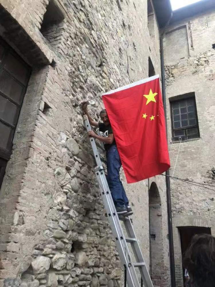 市西初级中学的演奏在一座有着600多年历史的城堡里,是一场露天的音乐盛会。那一天是他们的专场,意大利老爷爷特地在墙上挂上了大幅的五星红旗。