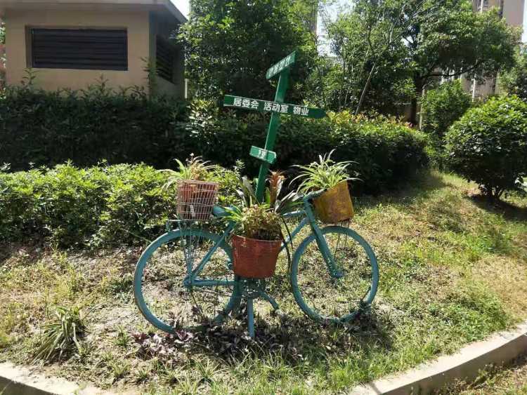 一进小区大门,就可以看到被刷成薄荷绿色的自行车做成的路标指示牌,上面标示着居委会、活动室、物业及几栋楼宇的方向,而车身则挂着3个由车篮做成的花盆,其中种植着吊兰等盆栽。