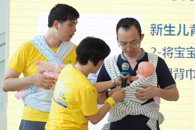 在今天母乳喂养周推广活动上,不少90后准爸妈参与互动:有哪些哺乳姿势、怎么样挤乳、如何使用背巾?不少现场的男士们显得低调而羞涩。