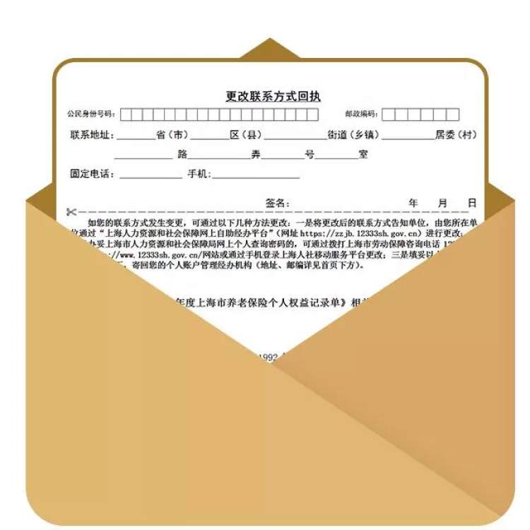 方式三:您可填妥历年个人权益记录单的“更改联系方式回执”,寄回账户管理的区社保分中心(原账户管理区、地址、邮编详见个人权益记录单)。