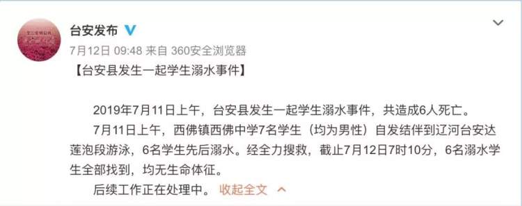 每年暑期,中小学生溺水事件时有发生,就在上个月的11日,辽宁省台安县西佛镇达连泡村附近辽河段发生一起多人溺水身亡事件,共有6名学生溺水身亡,遇难的6名学生均是当地西佛中学学生。