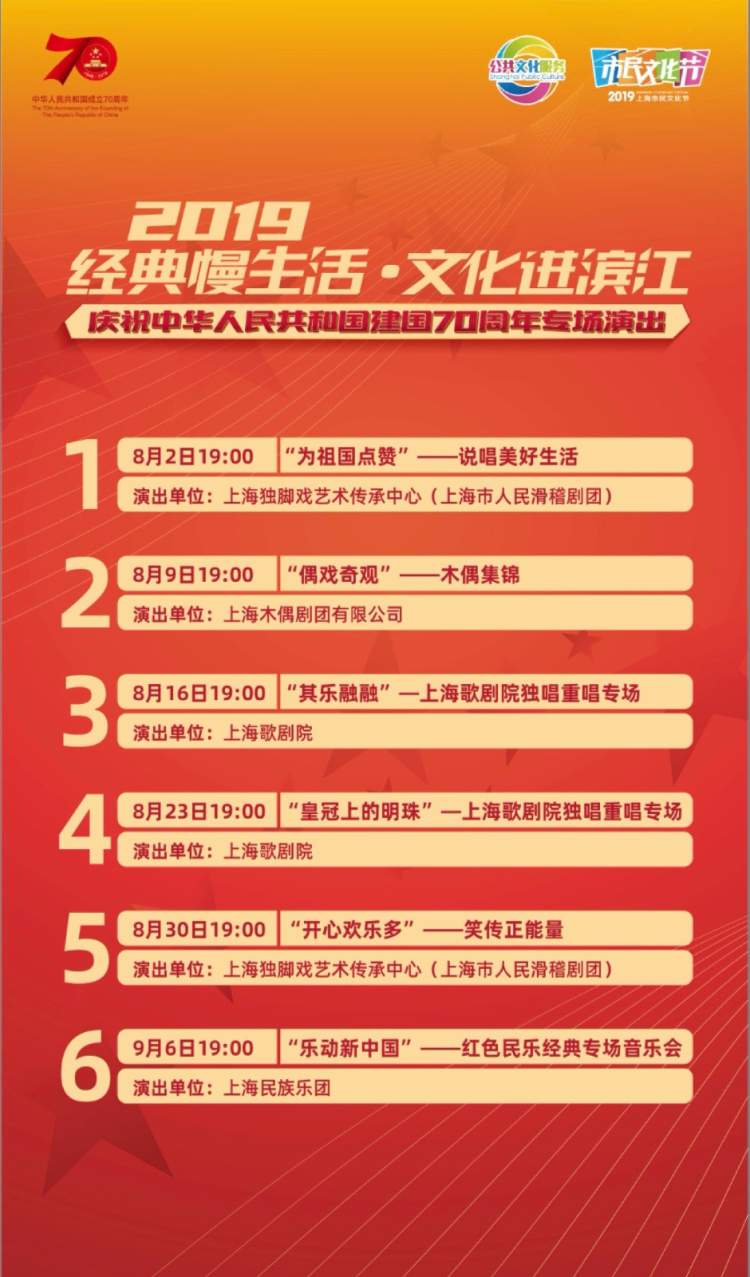 今年的演出结合“庆祝中华人民共和国成立70周年”主题和贯穿全年的上海市民文化节“市民美育在行动”主题,进一步聚焦公共文化建设“最后一公里”,为市民提供接地气的文化服务。