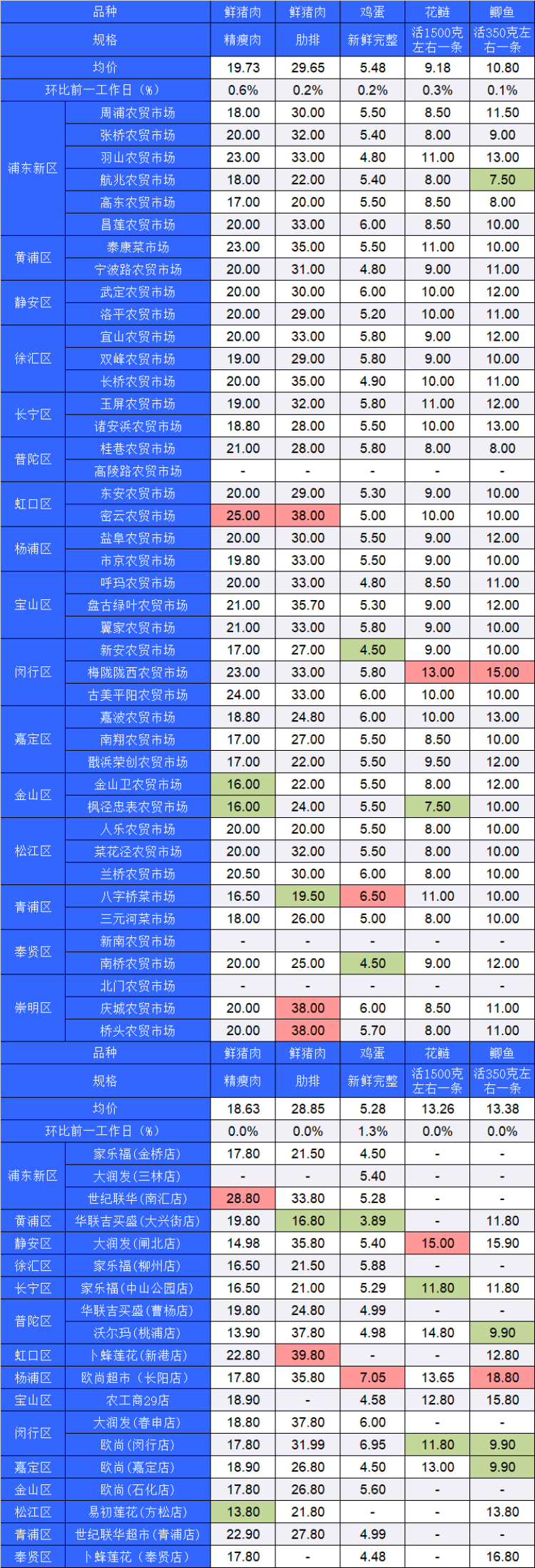 ■粉底标注代表该肉蛋鱼品种在上述农贸市场或超市的最高价;绿底标注代表该肉蛋鱼品种在上述农贸市场或超市的最低价