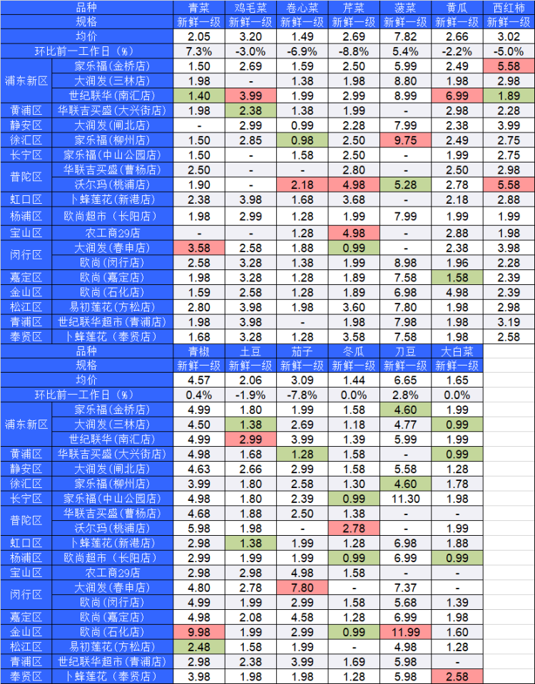 ■粉底标注代表该蔬菜品种在上述农贸市场或超市的最高价;绿底标注代表该蔬菜品种在上述农贸市场或超市的最低价