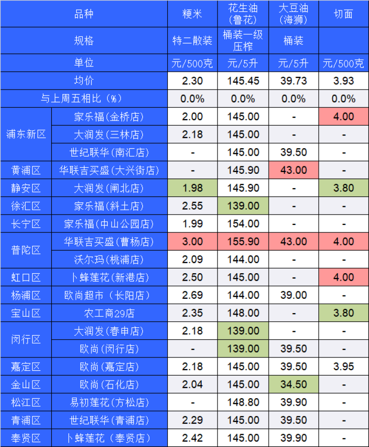 ■粉底标注代表该粮油品种在上述超市的最高价;绿底标注代表该粮油品种在上述超市的最低价