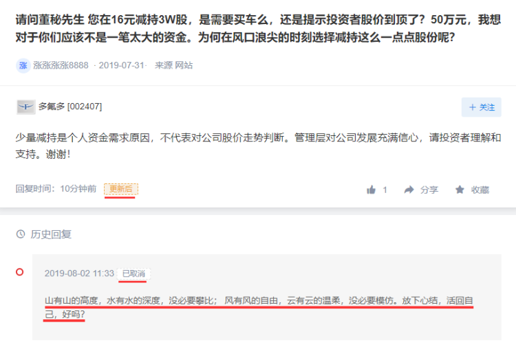 对此,今日午间,多氟多董秘回复:“山有山的高度,水有水的深度,没必要攀比;风有风的自由,云有云的温柔,没必要模仿。放下心结,活回自己,好吗?”