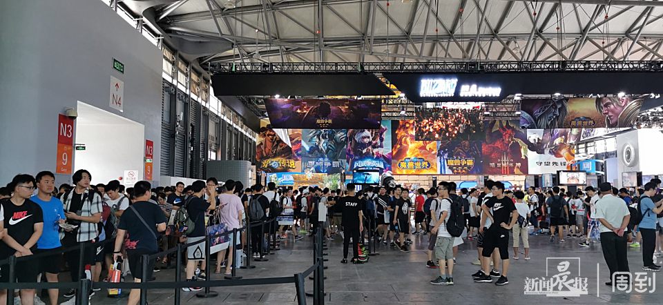 一位大约还要排队半小时的玩家告诉周到君,他已经排队一个小时左右,之所以这么执着地排队进场,是因为一是线下游戏的体验,还是和自己平时在家玩游戏有很大不同,另外也是想跟竞技选手交流交流,这样的机会蛮少。