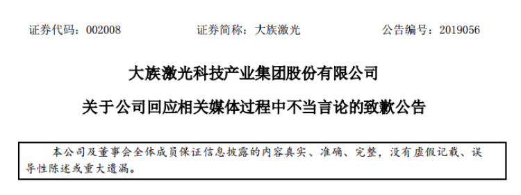 今日,大族激光发布了致歉公告,公告称,公司董事长近期在回应相关媒体过程中,因情绪激动发表了不当言论,公司及相关当事人对此深表歉意!