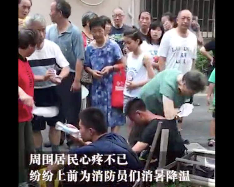 “我看大家都围着,就赶紧拿扇子给他俩扇扇风。”朱阿姨说,当时天气非常闷热,两个消防员低着头,贴身的衣服已经全部湿透,有点像中暑了,
