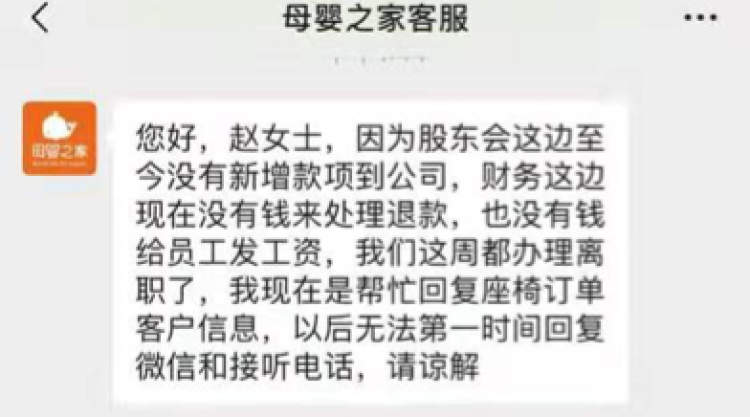 “客服一开始说,‘母婴之家’存在资金困难,让我等到七月中旬再退款,结果到了七月底,客服又说公司没钱了。”赵女士说。