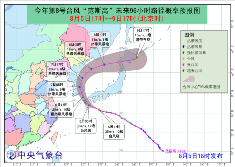 今年第8号台风“范斯高”今天下午由强热带风暴级加强为台风级,可能于今天夜间在日本九州岛沿海登陆,然后在朝鲜半岛附近逐渐转向东北方向移动,强度逐渐减弱。