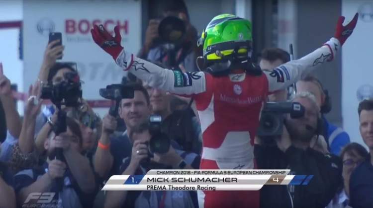 米克·舒马赫在冲刺赛中夺冠,他穿着全套红色的车手服,庆祝时他双手紧握拳头,还有他的下巴轮廓,都像极了父亲迈克尔·舒马赫。职业生涯的重要时刻,妈妈科琳娜和他的经纪人萨宾(也是他爸爸的经纪人)以及外婆、叔叔、姐姐、堂弟一大家子,都来到了现场。