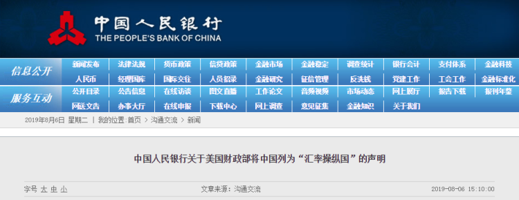 据中国人民银行网站,美国财政部将中国列为“汇率操纵国”,中方对此深表遗憾。