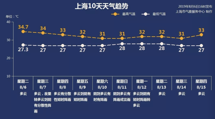 受风雨影响,未来几天本市气温逐渐下滑,周末两天最高气温或降至31℃左右。