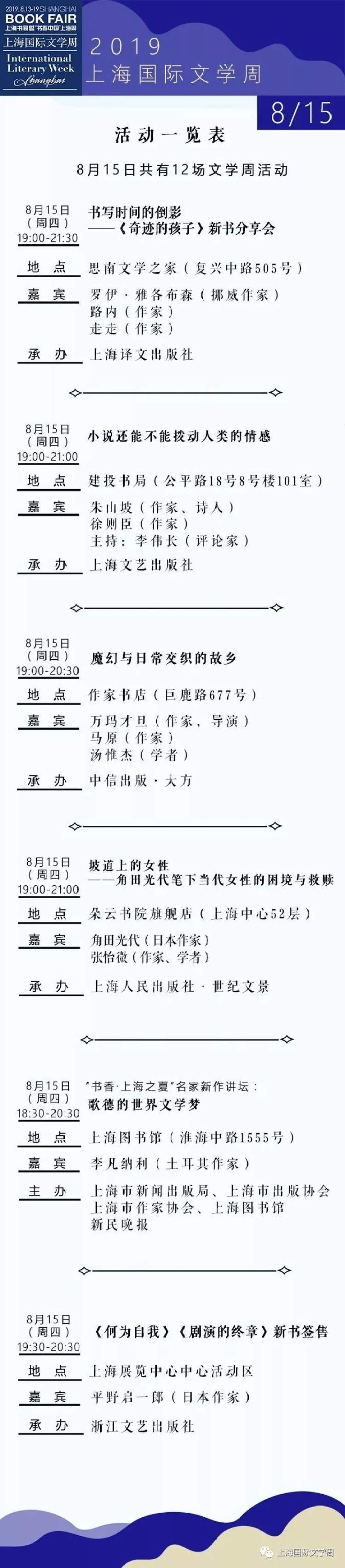 2019上海书展·上海国际文学周活动一览!与33位海内外名家面对面 杨婷婷 2019-8-06 来源:周到上海 上海国际文学周今年迎来第九届,将通过举办论坛、文学对谈、讲座和“诗歌之夜”等形式多样的50余场活动。 今年国际文学周以“家园”为主题,从结绳记事到文字编织,从片段音色到精致艺术,探讨人类如何寻找可供护佑的精神居所。 文学周邀请到包括英国作家林德尔·戈登,日本作家角田光代、平野启一郎,挪威作家罗伊·雅各布森,土耳其作家艾丽芙·沙法克,中国作家孙颙、叶兆言、宁肯、马原等在内的33位海内外名家。 活动总表↓ 来源:周到上海 作者:杨婷婷 赞一个 (0)