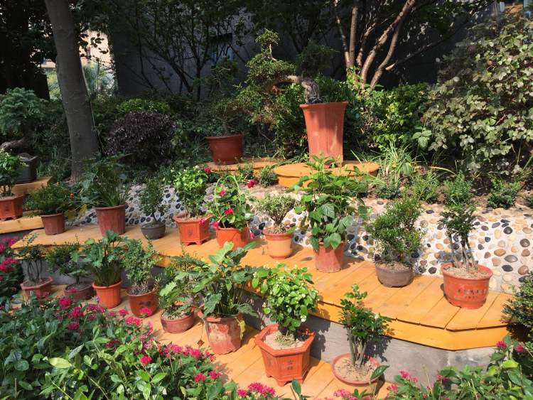 “壹米花田”呈长条状,由30余种、80余盆绿植组成。整体摆放错落有致,除了有月季、茉莉、栀子花等常见品种外,也不乏有小叶榆树盆景、罗汉松、澳洲杉等稀有品种。