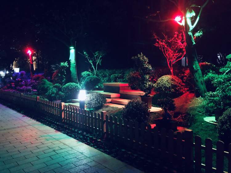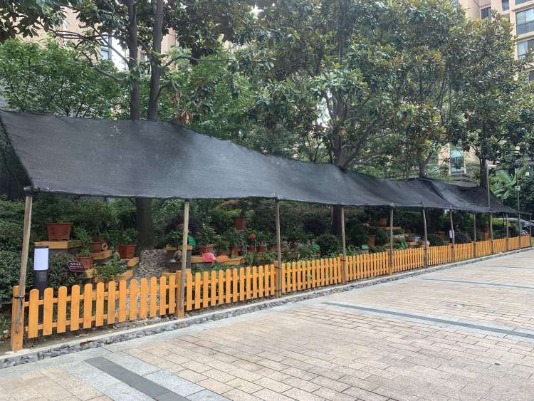 当下天气炎热,为了防止绿植遭受过强的阳光,居委会为花田装了尼龙顶棚;小区物业也免费为花田装上了斑斓的景观灯。