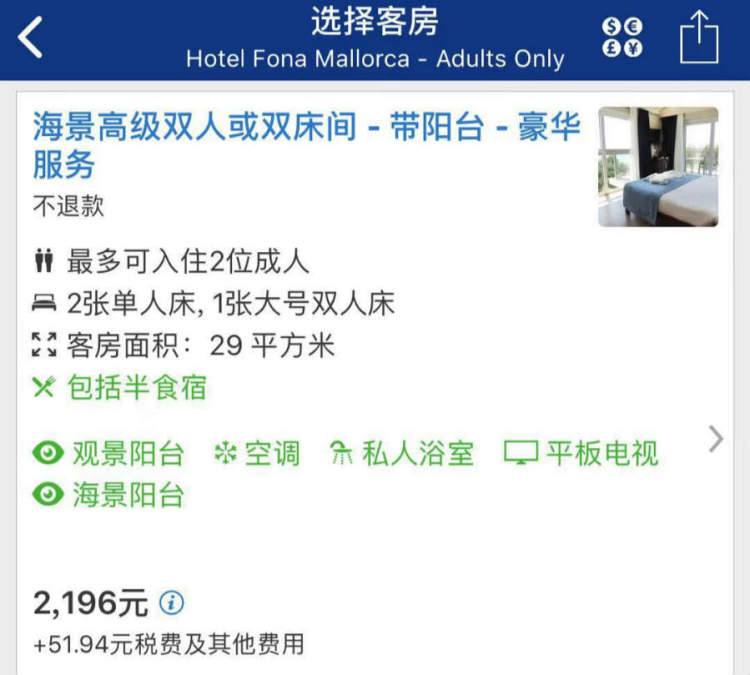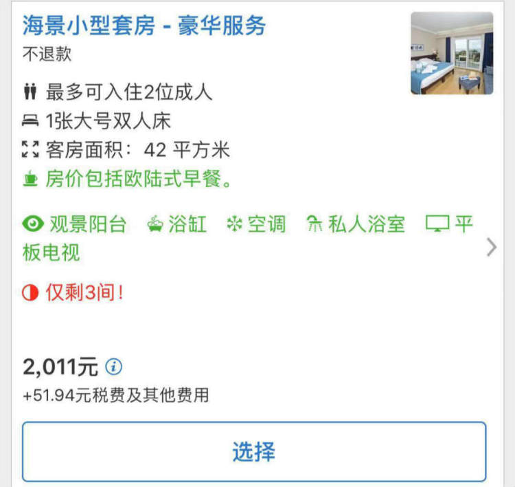 海景双床间和海景小型套房的房费都在2000元人民币出头: