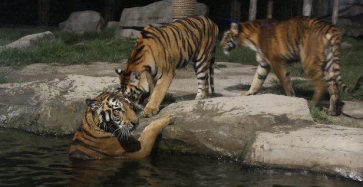刚才说了,动物园圈养的老虎、狮子早晨和黄昏比较活跃。所以,傍晚时分,在猛兽区,你会看到四处张望、晃悠的它们。老虎扑食展区里的一群老虎则正在为了食物而争斗,爬树、走梅花桩、跃入水池,使出十八般武艺就是为了获取更多食物。