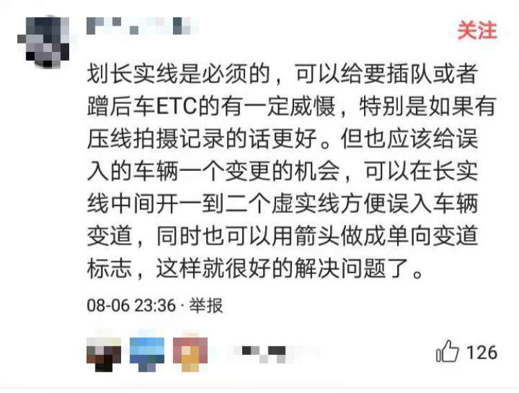 当然,也有网友认为画长实线是有必要的,因为这样可以威慑想要插队或者想要蹭ETC的车辆。但也不能“一刀切”,完全不给误入车辆一个变更的机会。