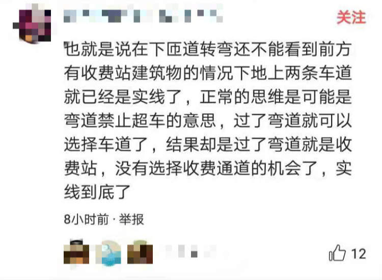一位网友表示,在下匝道转弯还看不到收费站建筑物的情况下,地上的两条车道就出现了实线,很多人可能会以为这只是“弯道禁止超车”的意思,想着过了弯道就能选择车道了,却没想到一路过去已经没有选择车道的机会了,这种设置的确容易误导人。