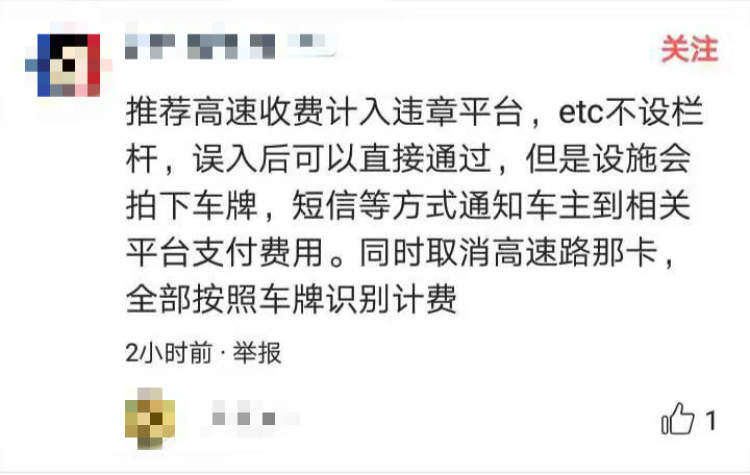 “推荐高速收费归入交通管理平台,ETC不设栏杆,误入后可以直接通过,但是设施会拍下车牌,通过短信等方式通知车主到相关平台支付费用。同时还可以取消高速公路手动取卡,全部按照车牌识别计费。”该网友畅想到。