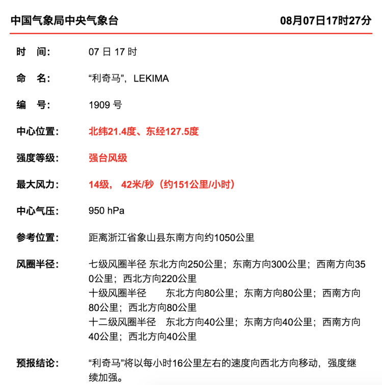 就在今天傍晚17点,中央气象台将其升级为强台风级,不过“利奇马”并不就此满足,它的强度还在继续加强。