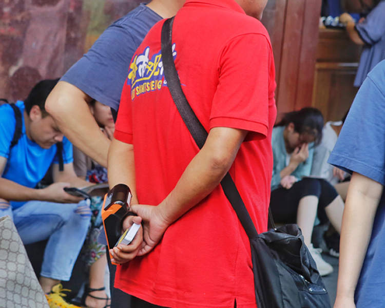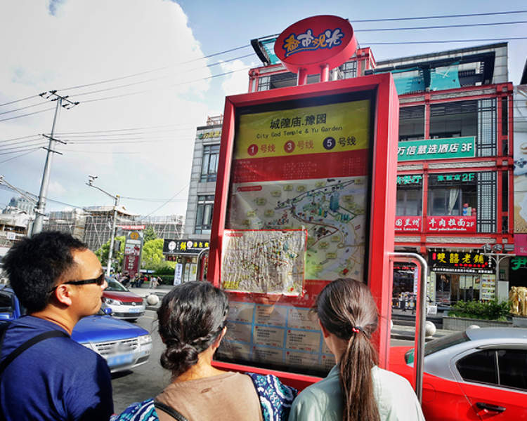在询问过人民广场站后,记者又来到了“都市观光”巴士在城隍庙豫园附近的换乘点,休息日期间,该站点红色站牌边换乘、询问、购票的乘客络绎不绝,非常热闹。