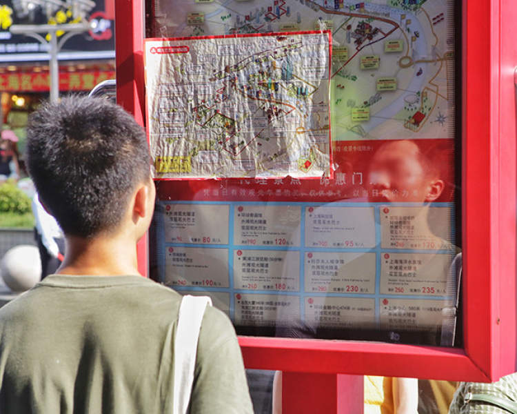 “都市观光”巴士,于杜莎夫人蜡像馆对面的地铁7号出口附近设有站点,约2米高的红色站牌上方印有清晰的“都市观光”卡通字样,站牌上标明了不同价格车票的使用权限,有支持游客24小时、48小时内随时上下观光车所有线路站点的40元、50元车票,以及24小时随时上下附带观光隧道项目的80元车票。