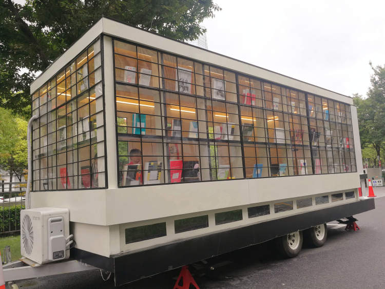近日,浦东图书馆门口惊现一辆白色箱体平板车。仔细看来,这辆黑白网格橱窗、方方正正的车颇具现代感。