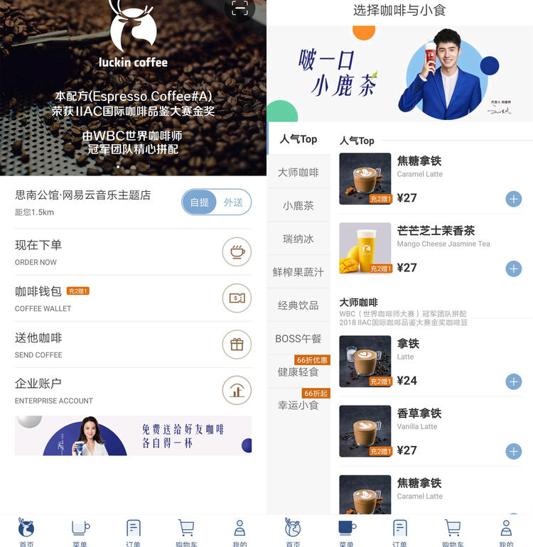 包括大师咖啡、零度拿铁、瑞纳冰、经典饮品、鲜榨果汁,都是Luckin Coffee APP上列出来的菜单。