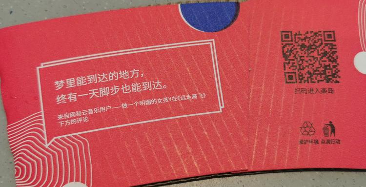 仔细看才能看到杯托中的玄机——背面印有来自用户的乐评,后期会不断更新文案,而杯托上的文案都是在楽岛上墙乐评中选择。