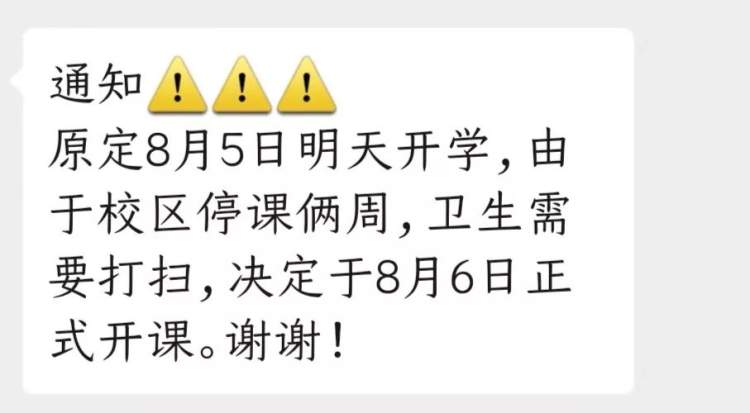 8月5日,两次延期后又该复课时,老师又一次通知,校区需要打扫卫生,需要再推延一天。