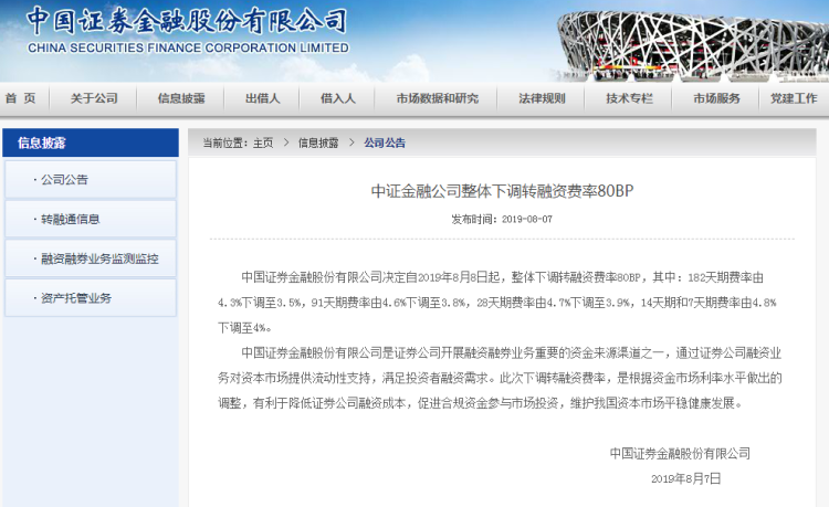 7日,中国证券金融股份有限公司决定,自2019年8月8日起整体下调转融资费率80BP,其中:182天期费率由4.3%下调至3.5%,91天期费率由4.6%下调至3.8%,28天期费率由4.7%下调至3.9%,14天期和7天期费率由4.8%下调至4%。