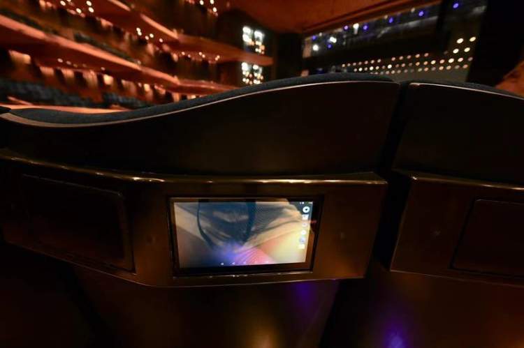 除了“5个特别”,记者还有一个发现——怎么这个新剧场一楼的观众席坐下来就像坐进了国际航班的机舱,每一张椅子后背都有一个ipad mini大小的显示屏。