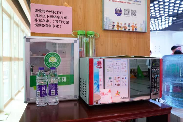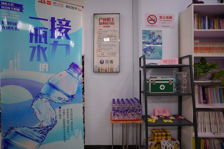 “自从有了这个户外爱心接力站,这片角落一下子就被利用起来了。平时我们点外卖的话,一般从楼上下来也需要一点时间,我们都会让他们先在这里休息一下,喝点水,很实用。”静安区党建服务中心的工作人员告诉我们,“在这里我们还不定期组织一些义诊,比如帮户外工作者们量量血压、中医把把脉等等。我们希望为他们提供一些实用的帮助。”