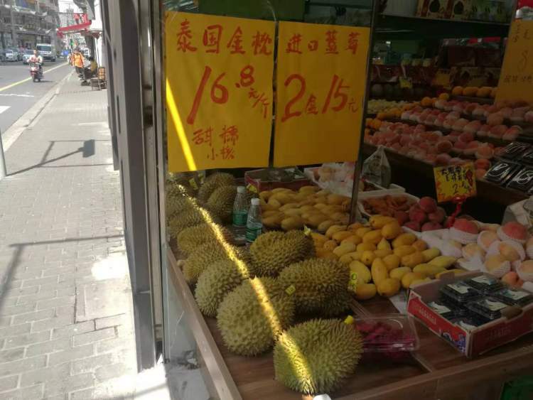 进入8月份之后,魔都大大小小水果店都在销售泰国榴莲。记者从宁海东路出发,沿途经过浙江中路、广东路、山东中路、宁波路上10多家水果店,发现2个月前只是个别店家在销售榴莲,部分店家只表示愿意预订榴莲,但2个月之后,有七八成水果店已经挂出牌子在销售榴莲。