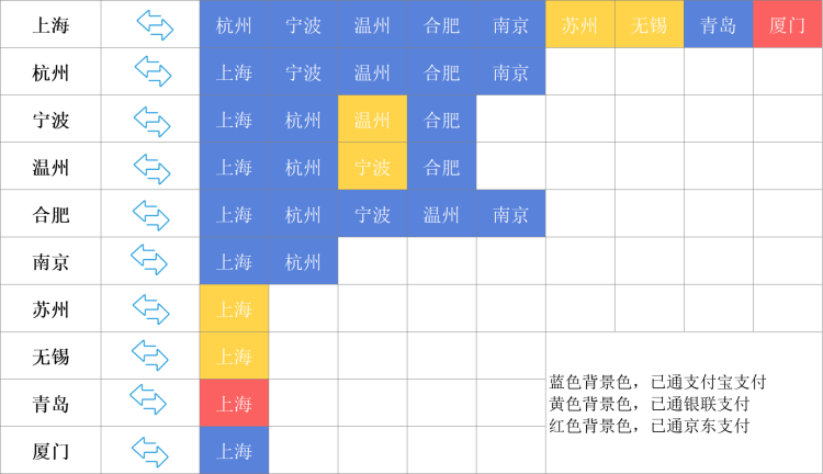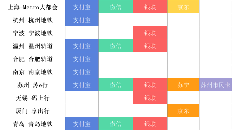 支持互联互通的城市共有上海、杭州、宁波、温州、苏州、南京、合肥、无锡、厦门、青岛10座城市。而在支付渠道上,各城市地铁支持的支付渠道略有不同(详见下表):