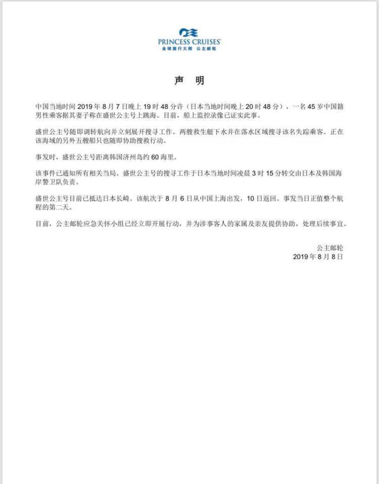 公主邮轮发布声明称:中国当地时间2019年8月7日晚上19时48分许(日本当地时间晚上20时48分),一名45岁中国籍男性乘客据其妻子称在盛世公主号上跳海。目前,船上监控录像已证实此事。