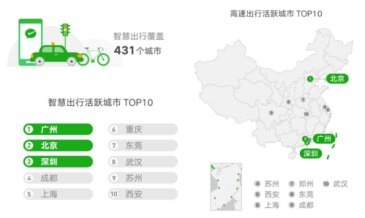 其中“智慧”增速最快的当属交通行业,数据显示,微信支付深入431个城市,覆盖公交、地铁、高速等八大场景,其中广州、北京、深圳位居全国前三,成都、上海等城市也迎头赶上。在高速出行方面,智慧出行能力沿“北广深”往周边快速蔓延;今年五一节期间,微信支付智慧出行同比增长215.8%。