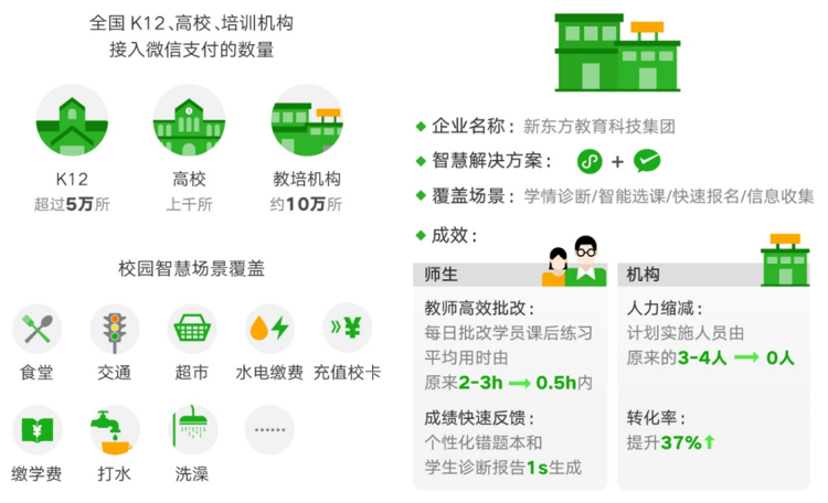 记者了解到,在校园内,微信支付可以运用的场景包括食堂超市、水电缴费、交通、充值校卡、打水洗澡等。而在教培机构,微信支付能够进行学情诊断、智能选课、快速报名、信息收集平台,极大缩减老师批改作业的时间, 1秒钟就能生成个性化错题本和诊断报告。