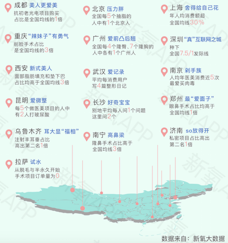 通过《白皮书》里“中国医美消费地图”可以看到,一线城市的医美更多处理的是压力带来的影响,比如发胖、脱发、初老。