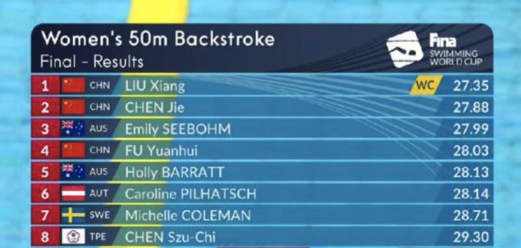 在昨晚结束的女子50米仰泳决赛中,作为该项目的世界纪录保持者,刘湘游出27秒35的佳绩,打破澳大利亚名将西博姆保持的世界杯赛会纪录,一举夺冠。