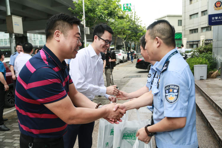 孙国强表示,良好的交通环境是“推动高质量发展、创造高品质生活”的重要标志,这次与青年企业家一同前来,一是深怀敬意而来,代表区工商联、青创联向烈日骄阳下坚守岗位、辛勤工作的交警支队全体民警“最可爱的人”致敬。二是带着使命而来,作为青年企业家开展“不忘初心、牢记使命”主题教育的一次实践活动,希望青年企业家能够主动向交警同志学习,主动履行社会责任,积极参与到“平安普陀”的建设中来;三是带着感情而来,希望青年企业家能带头弘扬和树立遵纪守法的典型,保持积极向上的精神面貌,与交警支队建立良好的联系合作机制,延续警民共建情。