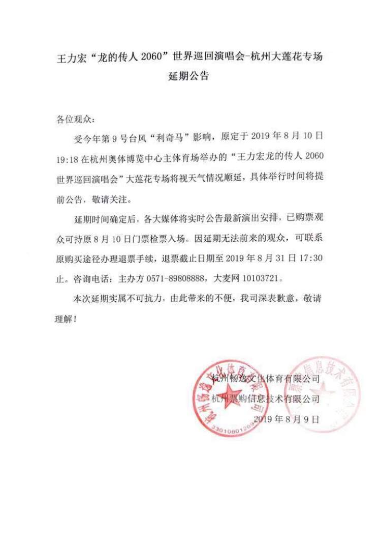 今日,主办方紧急发表延期公告:受今年第9号台风“利奇马”影响,王力宏演唱会顺延,具体举行时间主办方将提前公告。延期时间确定后,主办方将实时公告最新演出安排,已购票观众可持原8月10日门票检票入场。因延期无法前来的观众,可联系原购买途径办理退票手续,退票截止日期至2019年8月31日17点30分止。