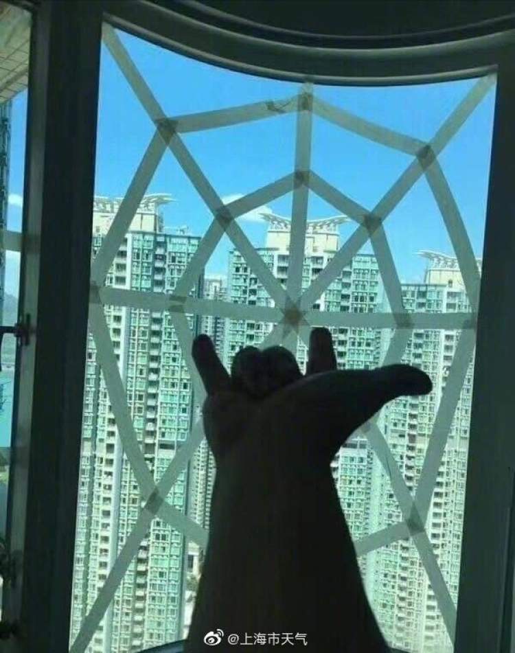 当台风黄色预警及以上的程度,就建议大家在窗户上把胶带贴成米字,或者贴成蜘蛛网的样子都行。