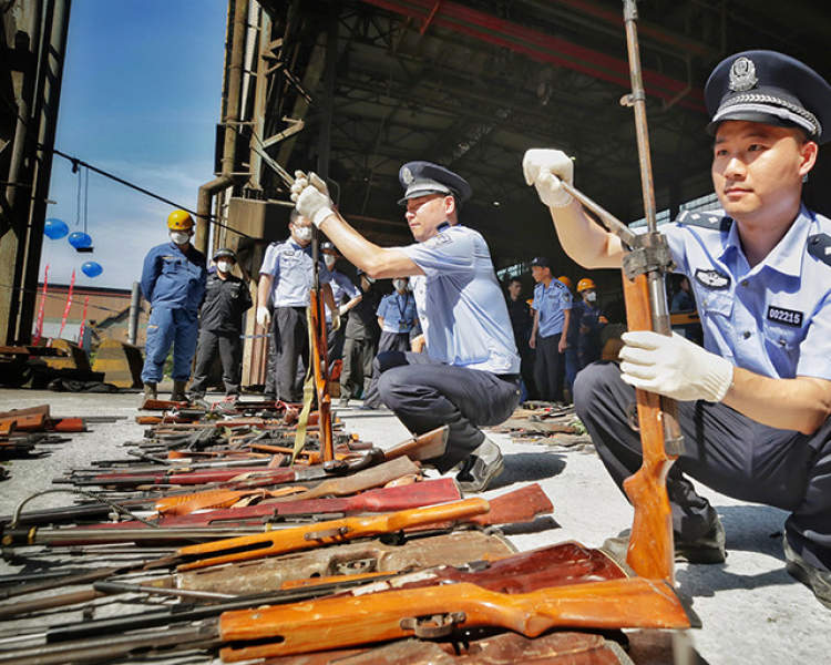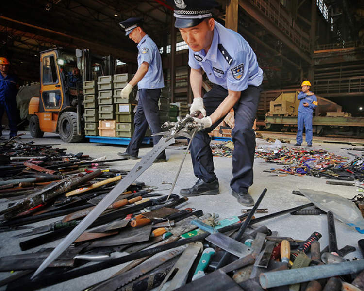 九环金背大砍刀、柳叶弯刀、“98K”、八倍镜……再“厉害”的刀具和枪支,都被放进炼钢炉中高温融化,化成钢水回收利用。