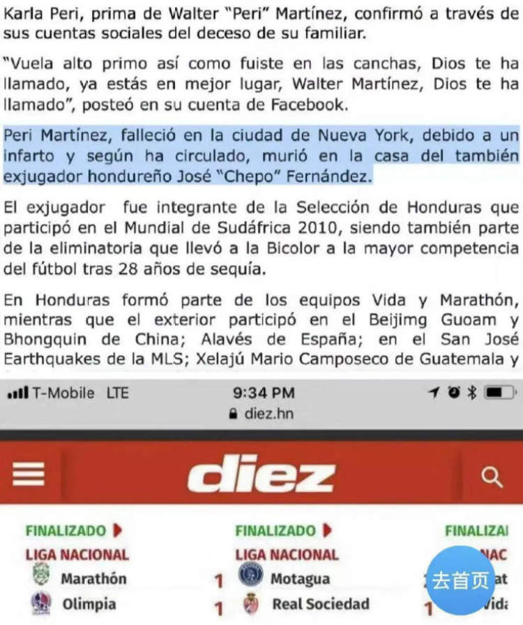 另一家媒体《Diez》则披露了更多细节:沃特尔·马丁内斯因突发心脏病,在纽约去世。当时他正在前洪都拉斯国家队队友何塞·费尔南德斯家中,突然发病。